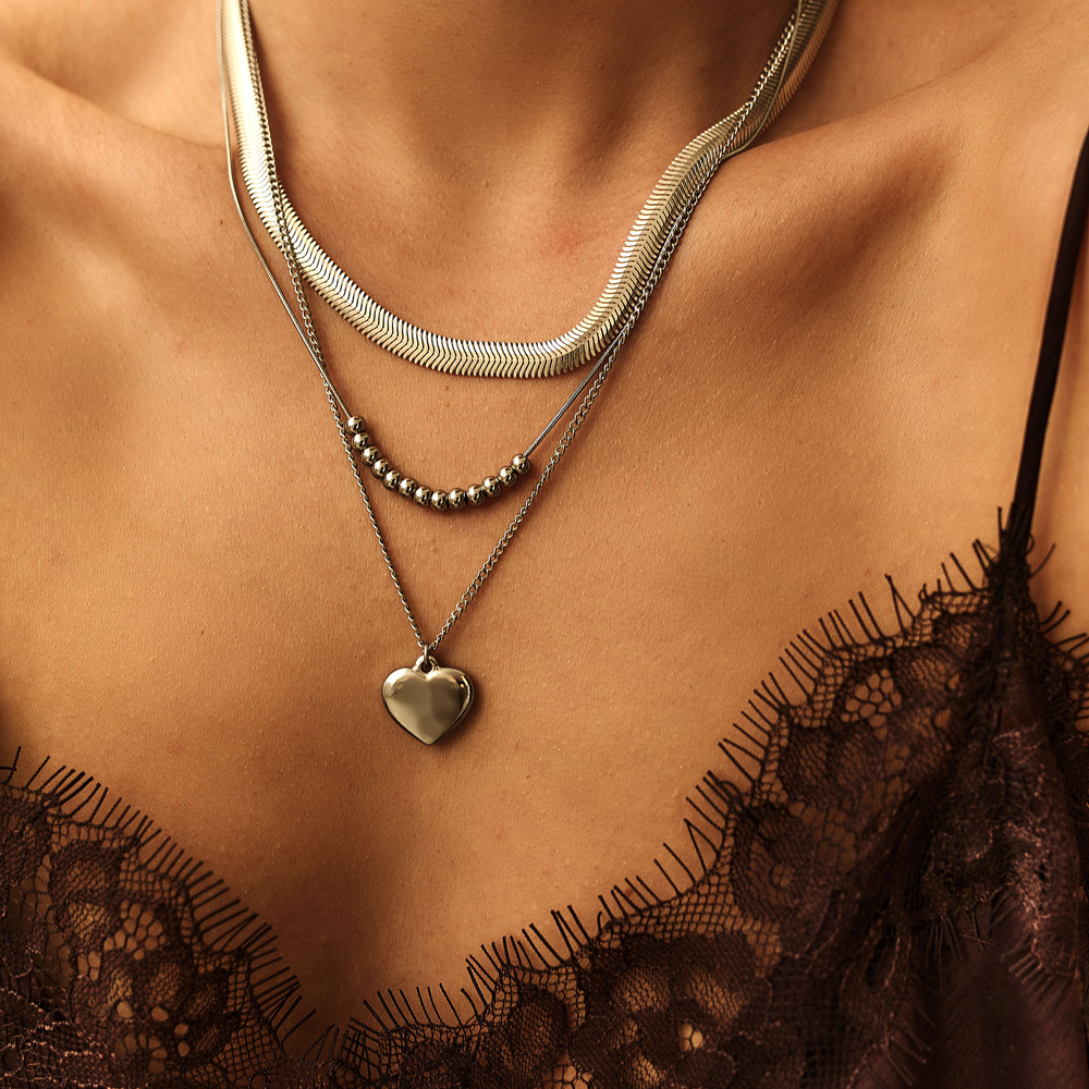 - Srebrny podwójny naszyjnika kuleczek z zawieszką w kształcie serca, wykonany ze stali szlachetnej 316L, pokryty srebrem.
